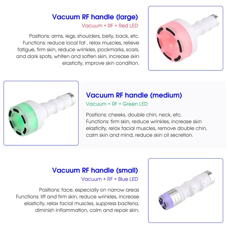 3.RF + Vacuum + Red / Blue / Green LED: RF energy combined with vacuum penetrates deep skin, generating heat to accelerate metabolism, collagen contraction and regeneration, activate adipose tissue, improve blood circulation and lymphatic detox, so as to reduce fat, relieve fatigue, firm skin, reduce wrinkles, increase skin elasticity, while green light calms skin and mind, reduces skin oil secretion.